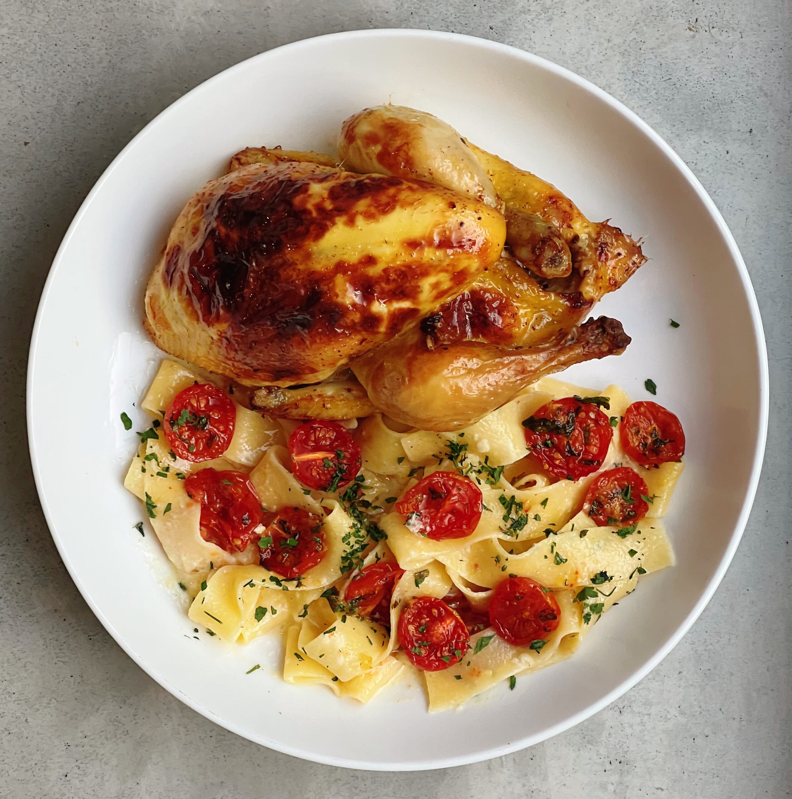 Haantje van de Hollandse blauwhoender, authentiek ras en duurzame kip, gevuld met een heerlijke romige ricotta vulling van rauwe ham en vers geraspte Parmezaanse kaas. Daarbij pasta al limone met gemarineerde tomaatjes uit de oven met knoflook en verse bladpeterselie.