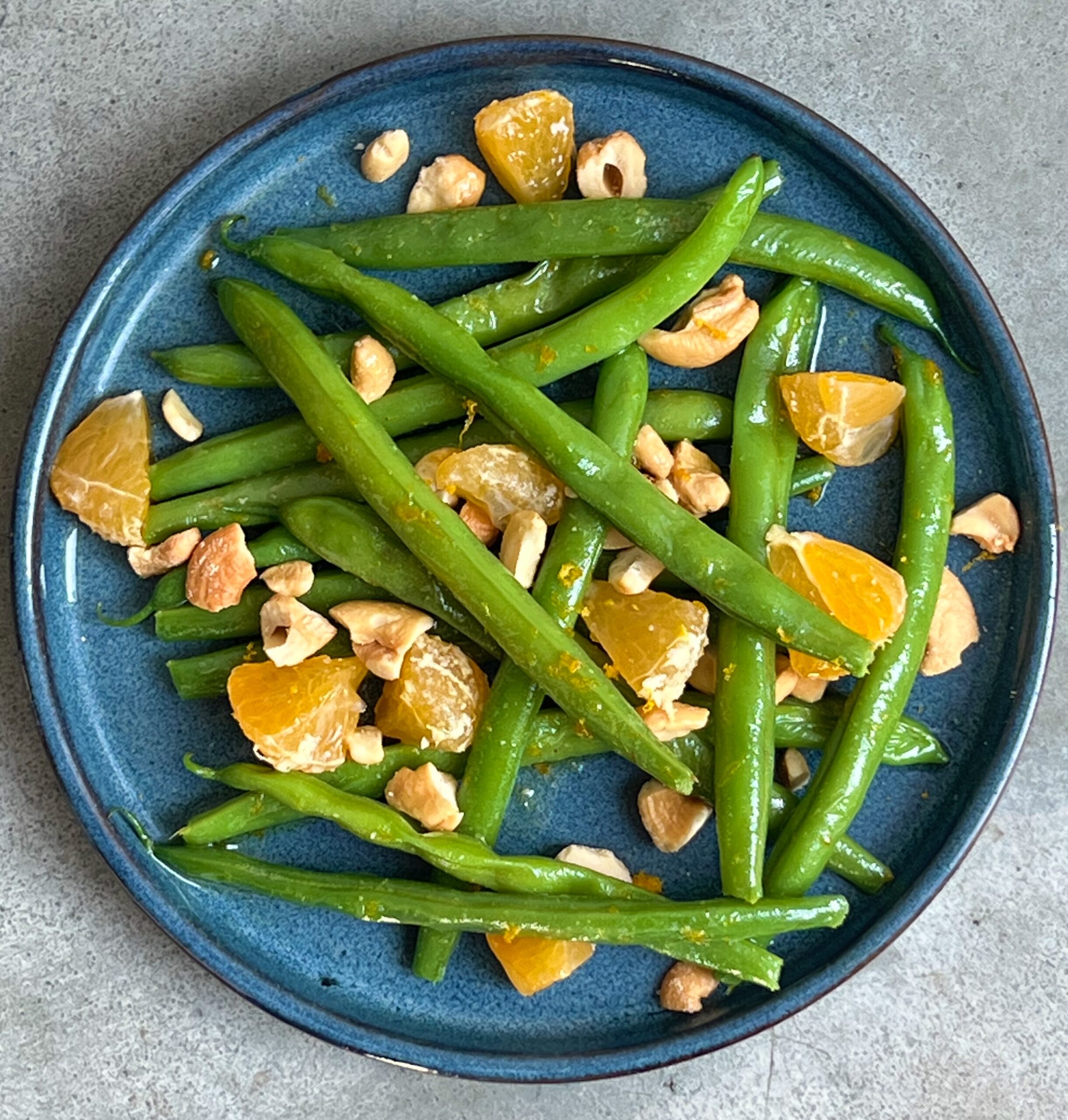 Heerlijke gezonde salade van sperziebonen in warme sinaasappelboter, stukjes mandarijn en crunch van cashewnoten. De sinaasappelboter met verse sinaasappelrasp is uiteraard homemade en geeft een heerlijke smaak aan de sperziebonen. Perfecte sidedish voor bij de curry!
