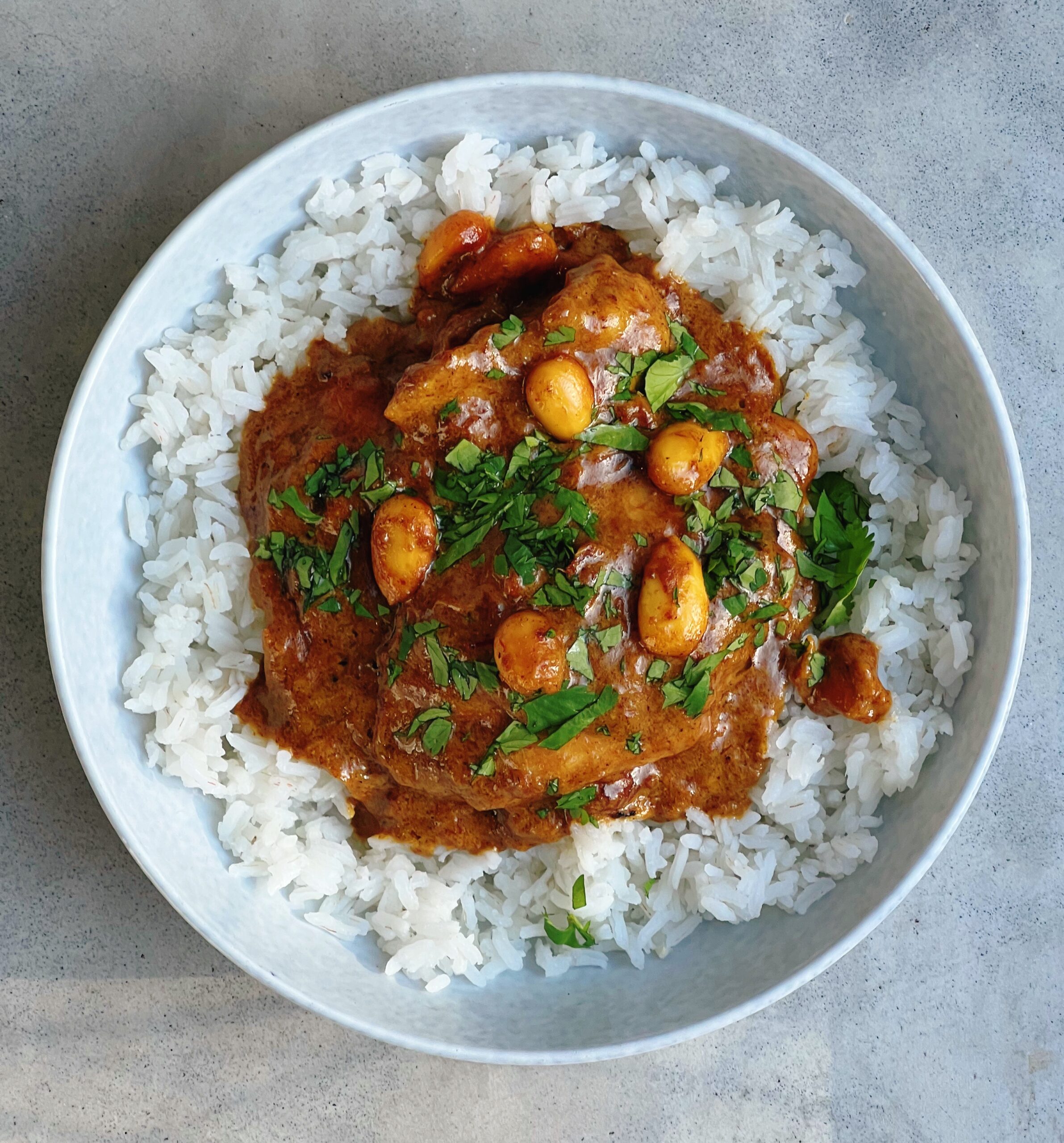 Traditionele romige Noord-Indiase milde curry met duurzame kippendij. Deze curry is inmiddels erg populair maar smaakt echt heel anders als je de curry helemaal zelf maakt.  De kippendijen worden 24 uur gemarineerd voordat ik ze stoof in mijn homemade currysaus. De geblancheerde en geroosterde amandelen voegen een heerlijke crunch toe en de rozijnen een zoetje aan deze romige curry.  De Kip Korma wordt geserveerd op een bedje van rijst met verse bladpeterselie.